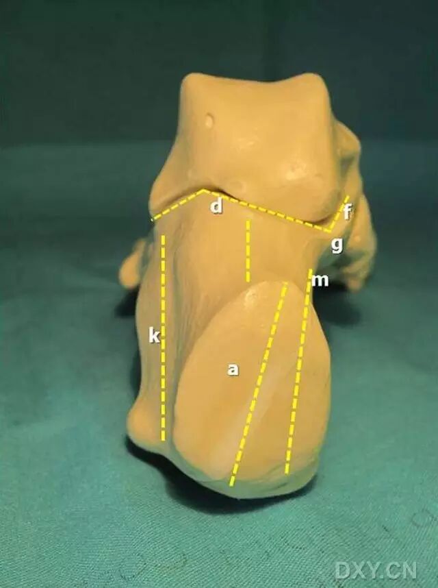 图1 跟骨后面观(如图所示,在三维空间中,包括跟骨结节、距下关节和跟骨内外侧皮质的轴线走行方向各异。a: 跟骨结节;d: 距下关节后部;f: 跟骨-距骨颈关节的内侧面;g: 载距突;k: 外侧皮质;m: 内侧皮质。)