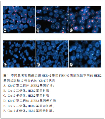 人类表皮生长因子受体2(HER2)基因,即c-erbB-2基因,是定位于人17号染色体(Chr17)长臂(17q12)上的原癌基因,该基因在 20%~30% 的乳腺癌患者中有扩增或过表达,是乳腺癌患者重要的治疗和预后指标。因此,准确判断乳腺癌患者的HER2状态意义重大。目前,临床上HER2的检测方法主要有免疫组化法(IHC)、荧光原位杂交法(FISH)等。作为临床检测HER2基因的“金标准”,FISH法具有较高的准确性和较好的可重复性。双探针检测系统中含有Chr17着丝粒(CEP17)探针作为内对照,通过计算HER2基因探针与CEP17探针杂交信号之比来判断HER2基因是否有扩增,同时还有助于对Chr17的非整倍体现象进行研究。
