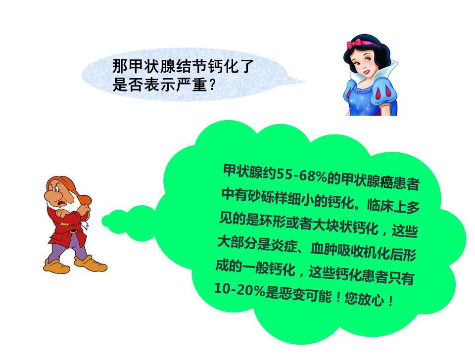 结节上有细小或砂粒样钙化者,可能为状癌的砂粒体。大而不规则的钙化可见于退行性变的结节性甲状腺肿或甲状腺癌。如在气管像中见有浸润或变形,则提示有恶性病变。