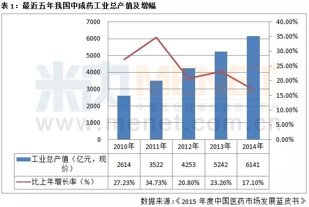 受国家实施中药现代化等因素拉动,我国的中成药工业取得了长足的进展,“十一五”期间的复合增长率为20.79%。进入“十二五”初期,增速有所提高,最高峰2011年增长34.73%,到了2014年则下滑至17.10%,完成总产值6141亿元。虽然有政府的大力支持,但行业整体大环境在慢速增长,中成药市场仍受到影响,最近几年的增速也在放慢。