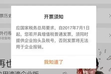 滴滴出行近日也开始提示消费者,“自7月1日起,开具增值税普通发票需提供企业抬头及税号,否则发票将无法用于企业报销”。