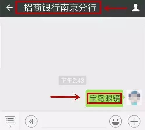 微信关注“招商银行南京分行”公众号,在微信底部对话框回复“宝岛眼镜”(如下图),点击弹出图文进入“小招特惠”页面,找到霸王餐模块中的宝岛眼镜活动,填写资料并向大家分享这条好消息。