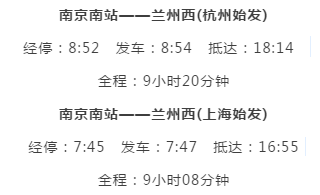 7月1日起,上海铁路局实行新的列车运行图。执行新图后,从杭州东、上海虹桥首次开行至兰州西的高速动车组列车,重点是,这些高铁都将经停南京南站,而且上午出发下午到,全程9个多小时!