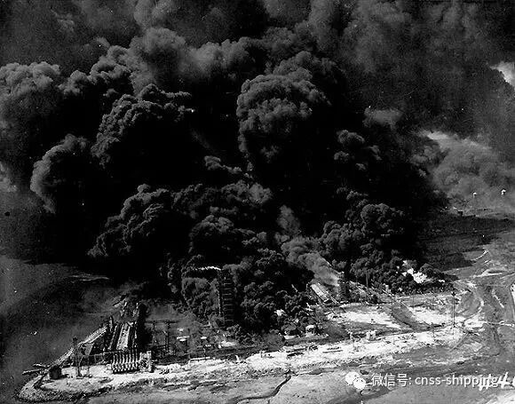 这是一张仰拍Grandcamp号甲板的照片。巨大的烟云正开始笼罩甲板。