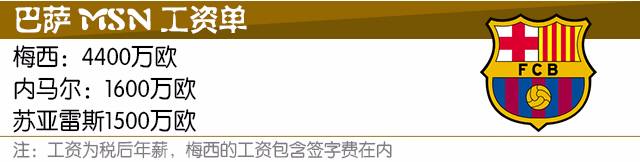 更为严峻的是队内攻击组合MSN的薪水占据的全队薪水总额的比例极高!苏亚雷斯年薪1500万欧元,内马尔1600万欧元(还不计入内马尔的签字费),刚刚续约三年的梅西的年薪加上签字费则高达4400万。每年巴萨光为这三人就要付出税后7500万欧元的成本,畸形的薪水分配也影响了巴萨其他球员的收入,阻碍了球队在转会市场上加强实力的计划,特别是对中场的重建。