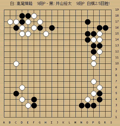 此后井山裕太顽强收束,打破白棋左方大空并围住下边,局势一度变得很细微。不过高尾绅路也没有乱了阵脚,以稳健的步调踏过一处处险滩,一直保持微弱优势,没有让井山完成逆袭。井山带着沉重的心情收完目数,最终盘面4目,白棋2目半胜出。
