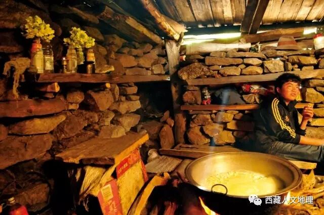 两夫妇请我们到木板房里坐坐歇脚。房子太小,我们十个人分了三批才进去。主人用酥油茶和水煮豆腐招待我们——豆腐在这里当然是难得的盛宴,我们怎好擅动,喝了碗酥油茶已经是精神大振,赶快出屋换外面的伙伴进来歇脚。临出去的时候我回头看了看这座四面漏光的石头木屋,屋里简陋的什么家什都没有,只有一个大锅煮着豆腐,一个木条拼的平台权当做床,一点粮食几瓶罐头。唯一扎眼的就是一个锃亮的铜碗,点着供佛的灯油,旁边十几个歪歪扭扭的矿泉水瓶插着采来的报春花。我好像一下子明白了这对夫妻为什么能在山上孤独的放牧了。