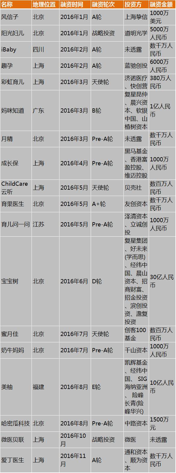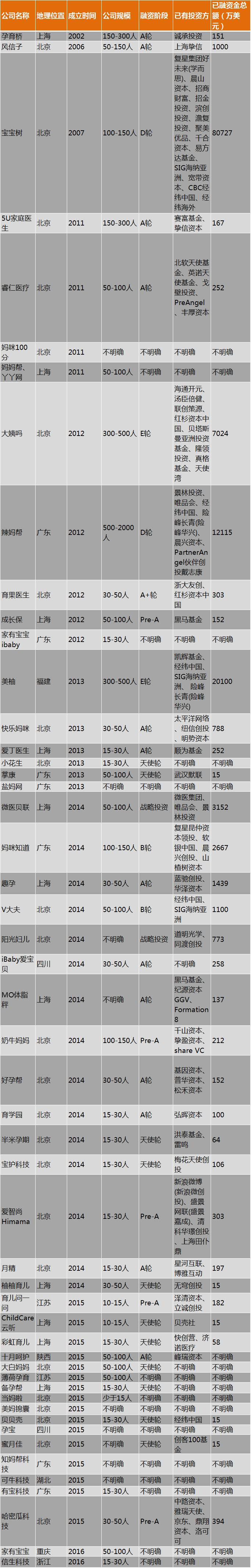 妇幼行业近几年的快速发展,催生了大量初创企业。我们统计了51家这个领域的企业,按照项目名称、创办时间、地理位置、融资历程进行了盘点。数据截止到2016年11月。