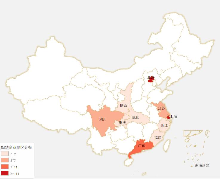 我们对51家妇幼行业初创公司地域分布情况进行了统计,这些企业的地域分布主要集中于东部发达地区。可将创业公司分为华北、华东、华南、华西四大板块,华北、华东是妇幼行业初创公司的主要聚集地。
