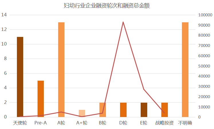 我们统计的51家公司中,有38家公开了详细的投融资状况,总融资金额达13亿4400万美元,其中2016年总融资额为6.5亿美元左右,占总融资金额的48%,这说明妇幼行业发展目前属于一个集中爆发阶段。中国妇幼行业以天使轮和A轮投资为主,占总投资案例数3/4以上。妇幼行业投资呈现投资轮次越靠后,单笔投资金额越大的趋势。D轮以后企业有4例,但投资金额也较大,都是女性健康、母婴综合类APP。A轮平均融资额为376万美元 ,B轮平均融资额为1883万美元,Pre-A轮平均融资额为249万美元,而天使轮平均融资额仅28万美元。天使期和A轮数量居多,说明妇幼行业创业还处于早期阶段,但是相应的独角兽企业也已经成熟。