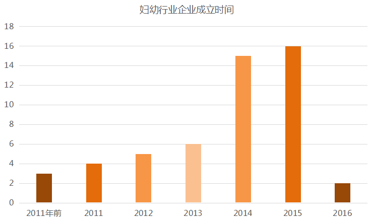 妇幼行业创业起步较晚,我们统计的51家公司中成立最早的上海臻鼎电脑科技有限公司(孕育桥)在2002年成立,早期的妇幼行业创业公司主要集中在PC互联网创业领域,以论坛、社区为主,比如宝宝树。2011年开始,随着移动互联领域的大潮,妇幼行业创业公司数量开始快速增长,到2014和2015年达到最高峰。2014年创业公司达到15家,随后的2015年有16家,这个时间段创业公司的增加主要是因为移动互联网的兴起以及国家放开二胎政策之后人们对妇幼健康的关注度上升等因素,创业领域主要集中在移动互联网领域,智能化、数据化的创业模式将成为妇幼行业未来医疗健康大趋势。