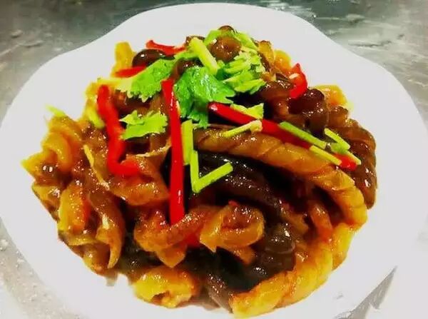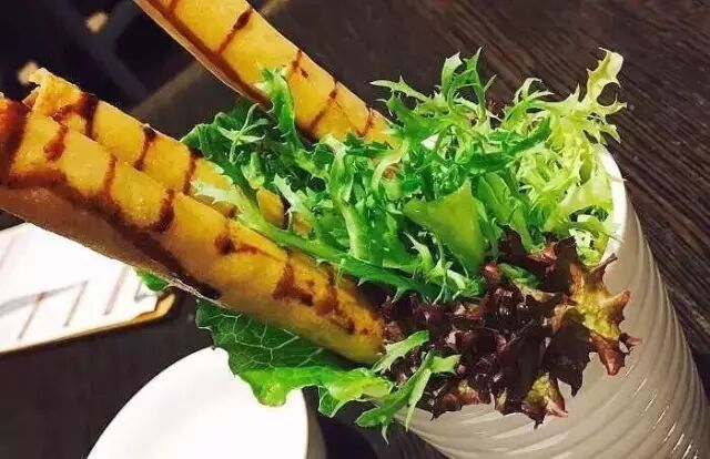 陈醋脆三▶比筷子略粗的蛋卷皮里包的是金针菇丝、笋丝、杏鲍菇丝,蛋卷皮外螺旋状淋上进口巴沙明哥醋,咬一口先是蛋皮的酥脆,接下来是三丝的柔韧,然后在口中以陈醋中和,咸味中略带酸甜。