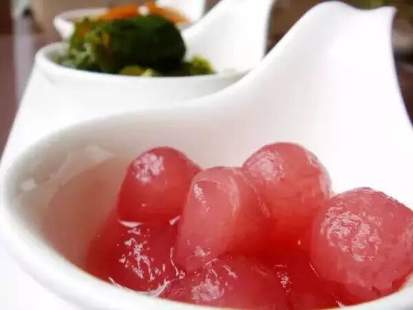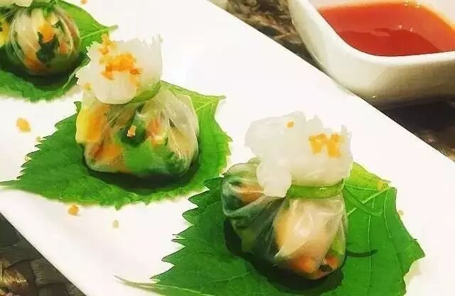 水晶石榴包▶颜值担当。表面是水晶面皮,里面是各种蔬菜丁,配的蘸酱是腐乳的,酸酸咸咸,与垫在下面的紫苏叶搭配在一起味道更佳。