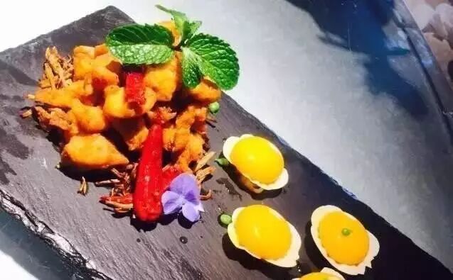 芒果蛋黄脆椒鸡▶鸡蛋壳里面的全是芒果,做成了鸡蛋黄的感觉。旁边辣辣的炸鸡是用素鸡做的,味道很不错。