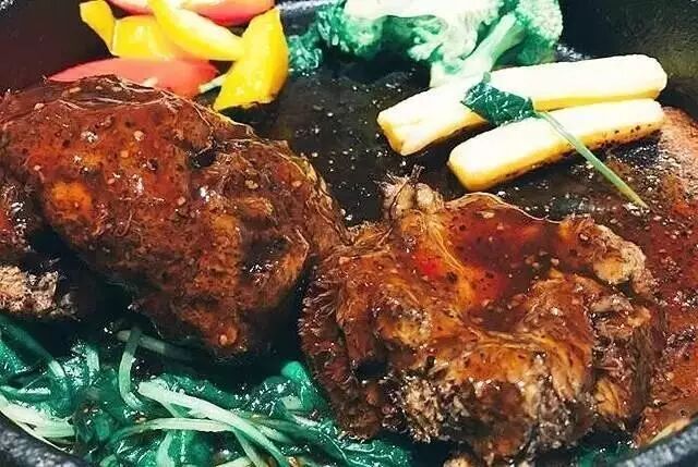 黑椒猴菇排▶比较有新意的一道菜,用猴头菇代替牛排,黑椒酱汁的味道很正且黑椒的颗粒分明。铁板上还配以西兰花、小玉米等辅料,卖相很是精致。