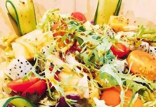 油醋水果沙拉▶果蔬丰富,无论卖相还是味道都属上乘,火龙果经过油醋的提升,有了和以往中庸味道不同的酸甜,略带咸味。