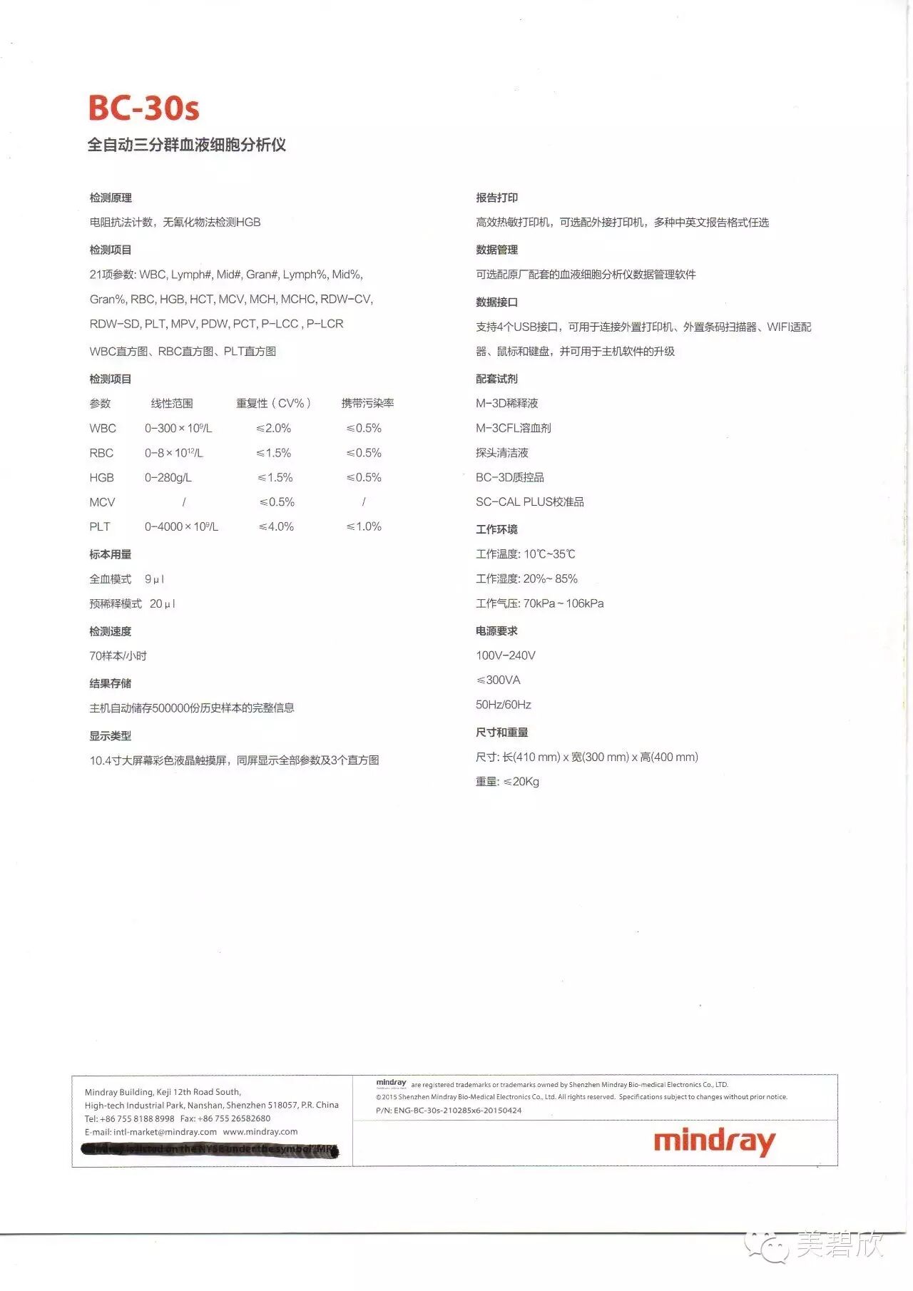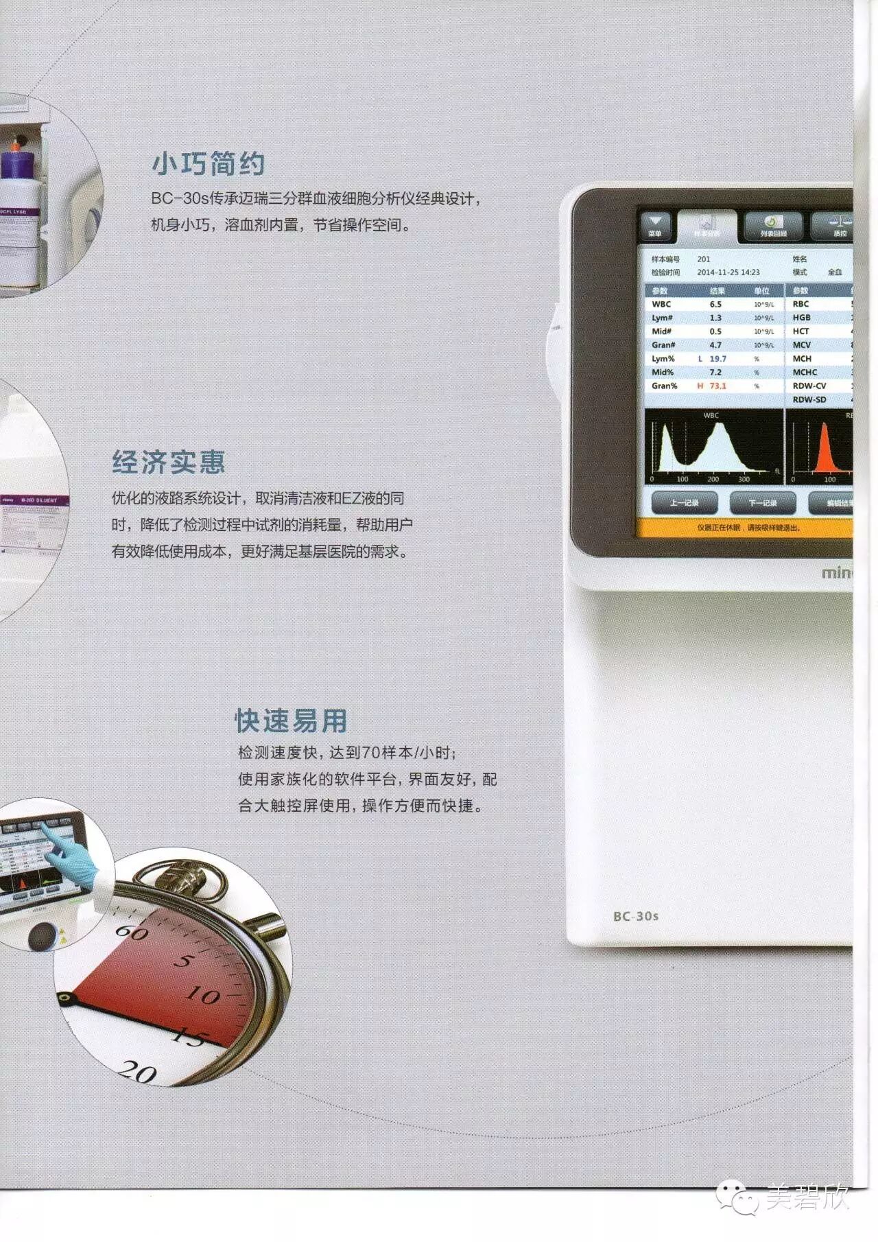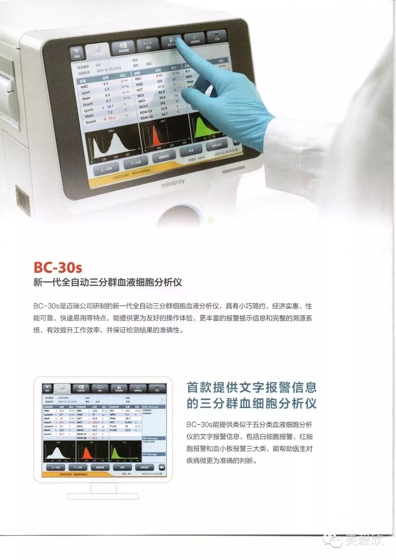 BC-30s是迈瑞公司研制的新一代全自动三分群血液细胞分析仪,具有小巧简约、经济实惠、性能可靠、快速易用等等特点,能提供更为友好的操作体验、更丰富的报警信息和完整的溯源系统,有效提升工作效率,并保证检验结果的准确性。