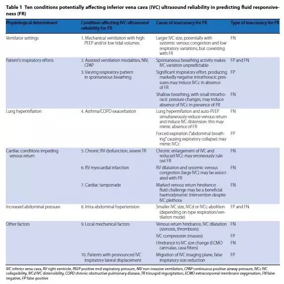 从生理角度看:下腔静脉超声不能准确预测液体反应性的十种情况评估下腔静脉内径(IVC)及其随呼吸的变化已经成为评估严重低血容量、预测液体反应性、液体负荷耐受性的一种方法。下腔静脉内径大小、下腔静脉塌陷率(IVCc)、下腔静脉膨胀率(IVCd),是急诊室及ICU医生用来预测休克病人液体反应性的手段。由于下腔静脉超声图像易获得,测量重复性好及超声设备日益精进,使得这项技术很快推广应用。不同结论的文章已有发表,然而临床上不恰当的使用可能会带来误导。在生理的角度和范畴,有限的证据表明在一些临床情况下,IVC大小及其随呼吸变化并不依赖容量状态,并不能准确的预测液体反应性。虽然没有特定的调查研究,但这些临床情况能根据其主要生理特性分类描述,如下表(Table1)。机械通气病人的IVCd在低水平的PEEP下能有效评估液体反应性。已经证实高PEEP使右房压、下腔静脉压升高,使下腔静脉内径变大且不易于改变,同时静脉回流减少,这是导致评估下腔静脉与液体反应性之间关系偏差的一个因素。再者,从理论上讲,当潮气量小于8ml/kg时,胸腔内压力和容量变化较小,IVCd也较小,不能很好的反应容量状态。有证据表明这时候通过IVCd评估液体反应性敏感度低,且不十分准确(表中第1条)。 在自主呼吸或完全被动通气的情况下,下腔静脉内径随呼吸变化能有效评估液体反应性。吸气时,这两种情况均引起腹内压升高,胸腔内压降低。而在辅助通气/无创机械通气病人吸气时,夹杂着病人做功,机械通气产生的正压与病人自身吸气时产出负压相互作用,因此,此种情况下,IVCc与前负荷失去了明确的关联(表中第2条)。关于IVC预测液体反应性,在应用CPAP支持的病人中并没有的相关研究。在自主呼吸中,并没有关于不同的呼吸模式与下腔静脉评估液体反应性的研究。在自主呼吸时,胸腔内压与潮气量很难量化,从健康自愿者身上获得的数据表明,呼吸越深,横膈运动幅度越大,IVCc越明显,这与容量状态无关。这提示表浅的呼吸可以降低IVC预测液体反应性的敏感度。同样的,用力呼吸扩大IVC塌陷,这样降低IVC预测液体反应性的特异度(表中第3条)。哮喘或COPD加重会引起肺过度膨胀,使内源性PEEP增加、胸腔内压增加,这类病人在自主呼吸呼气末IVC是扩大的,同时吸气时胸腔内负压增大使IVC塌陷。虽然没有大规模的调查研究,但这些现象引起的改变影响IVC大小及其塌陷,而这与容量、液体反应性无关。哮喘或COPD病人用力呼气的作用(伴随腹内压的增高)也影响IVC的大小,相反导致IVC呼气塌陷,而不是吸气塌陷(表中第4条)。慢性右心功能障碍,三尖瓣返流,慢性肺心病导致右室重塑、顺应性差、右房压升高、慢性IVC增宽、吸气塌陷减少,这种情况下IVC大小及其预测液体反应性,超过有效的诊断截断值(表中第5条),而针对这类病人的IVC呼吸变异率和液体反应性尚缺乏相关数据。此外,严重三尖瓣返流的病人,IVC扩大与容量状态无关。 右心室心肌梗死导致急性收缩、舒张功能障碍,右室顺应性下降,导致右侧不协调的充盈压增加、体循环淤血。在某种程度上右心成为了静脉系统和左心的通道。此时,尽管下腔是宽的,但左室运动增强,病人有液体反应性。(表中第6条) 心脏压塞阻碍心脏回流,引起体循环淤血。超声发现下腔静脉宽大、固定,但这并不等于没有液体反应性,当治疗需要时不能不给予液体复苏(表中第7条)。腹内高压及腹腔间隔室综合征,下腔静脉大小及其变异率与跨壁压相关,受腹部与胸腔内压梯度影响。研究表明腹内压增加,降低IVC大小,这与容量状态无关。此外,腹内压可压迫下腔静脉使之变形,而且腹高压有可能影响基于IVC的液体反应性(表中第8条)。局部机械因素:下腔静脉受限、受压、血栓形成、静脉滤器植入、ECMO通道建立等机械因素可能影响下腔静脉大小及其变异率,使应用下腔静脉评估液体反应性失效。VV-ECMO和VA-ECMO通常将导管置入到下腔静脉,限制其塌陷(表中第9条)。而且ECMO下腔静脉通道建立的病人,静脉内负压影响IVC大小及其随呼吸变化,有可能在导管周围出现静脉完全塌陷。静脉滤器、下腔静脉血栓压迫血管占据血管同样影响下腔静脉。另外,一些病人也许在吸气期间,下腔静脉横向运动比较明显,导致下腔静脉评估不准确以及过高的评估了IVC及IVCc。这种情况下,长轴不确定的时候,可以用短暂辅助确认一下(表中第10条)。超声评估下腔静脉做为评估危重病人血流动力学状态的一部分非常简便,但是能否准确的指导临床决策,关键在于对其应用的基础理论的理解。测量一定是在病人的病理生理状态下进行(包括是否机械通气、机械通气模式、参数等),它必须与其它的检查结果相结合,如心脏超声、甚至全身超声等。虽然被证实在某些病人中下腔静脉超声评估液体反应性非常有效,但在相当一部分ICU和急诊室的病人中,基于下腔静脉评估液体反应性并不适用。需要开展更多研究来探讨上述临床情况下下腔静脉评估液体反应性的准确性。原文链接:https://yunpan.cn/cBFNUeHpArvdt 访问密码 48bc
