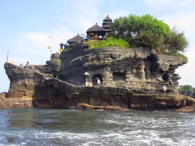 海神庙坐落在海边一块巨大的岩石上,每逢潮涨之时,岩石被海水包围,整座寺庙与陆地隔绝,孤零零地矗立在海水中;只在落潮时才与陆地相连。对岸有小亭可以眺望日落景色,成为巴厘岛的一大圣景。