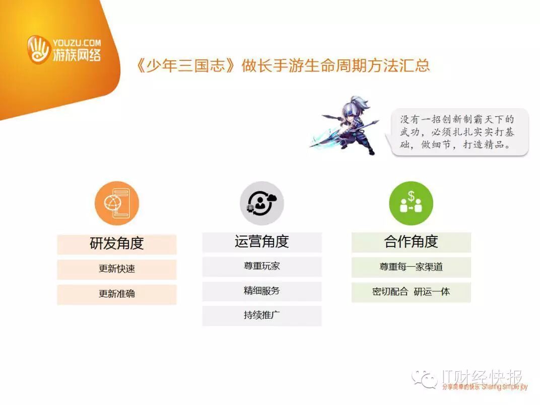 回到发行体系,《少年三国志》的发行可以用一句话来形容,就是打造玩家本位的发行体系,远离涸泽而渔的方式。从本质上来说,内容产业最终要回归到用户,而玩家本位的发行体系就是以用户为核心。据悉,《少年三国志》运营团队十分注重与用户的沟通,以高达150万粉微信公众号与50万关注的官方贴吧为主阵地,无论是流量导入、版本更新还是日常运营时,都要多征询玩家的意见,同时通过数据分析掌握好活动周期,很大程度上提升了用户的活跃度。
