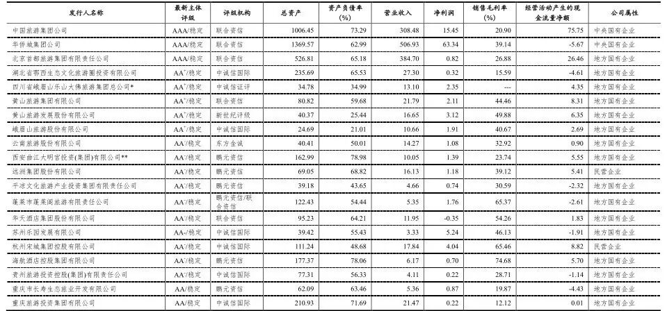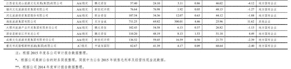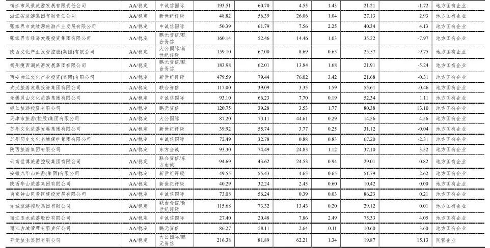 [6]其中开元旅业集团有限公司、龙城旅游控股集团有限公司、陕西文化产业投资控股(集团)有限公司、扬州瘦西湖旅游发展集团有限公司、云南世博旅游控股集团有限公司和张家界市经济发展投资集团有限公司合计6家企业进行了双评级。