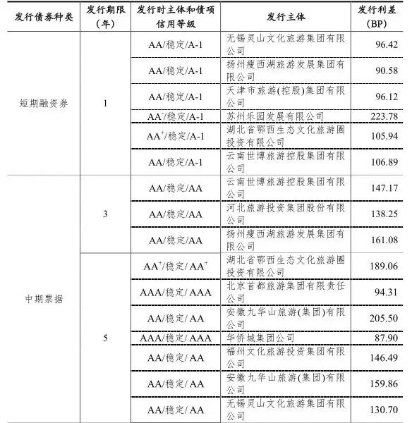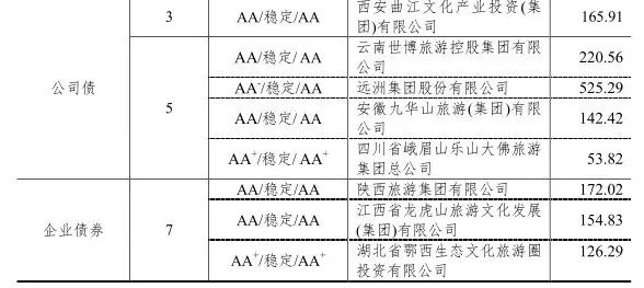 [5]其中天津市旅游(控股)集团有限公司、湖北省鄂西生态文化旅游圈投资有限公司、安徽九华山旅游(集团)有限公司、北京首都旅游集团有限责任公司、华侨城集团公司、无锡灵山文化旅游集团有限公司、扬州瘦西湖旅游发展集团有限公司、云南世博旅游控股集团有限公司以及中国旅游集团公司(原中国港中旅集团公司)发行了多期债券。