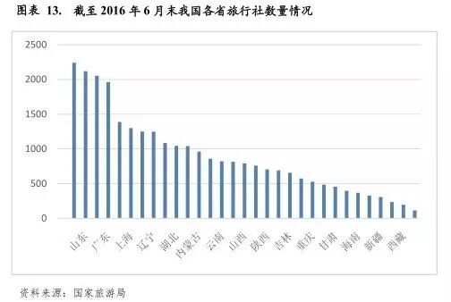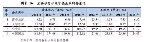 目前,我国旅游行业子行业主要包括景区经营、酒店餐饮、旅行社等。从国内旅游市场的竞争格局看,虽然我国旅游业的总体规模已经位居世界前列,但发展模式单一,多数企业旅游产业链尚未完善,现代旅游项目同质化严重等问题依然存在。仅从上市旅游公司的数量来看,据Wind资讯数据显示,2015年末我国全部A股上市公司共2855家,其中旅游行业上市公司仅有24家,占比不到1%。旅游类上市公司比重较低的现象与旅游业在国民经济中的重要地位不太相称,在一定程度上也说明目前旅游类公司的整体实力偏弱。