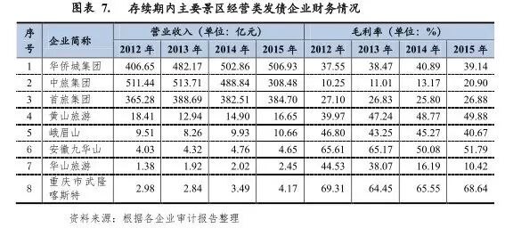 从行业竞争方面看,以债券市场存续期内的景区类发债企业为样本,据申万行业分类,截至2016年6月末,我国景区经营类发债企业共40家。受景区资源的特殊性影响,其中36家为地方国有企业,,其余为民营及其他类型企业。[2](简称“中旅集团”),,因股东背景较好、业务范围涵盖旅游景区经营、旅行社、物流贸易、电子、旅游地产、酒店等,经营较为多元化,抗风险能力强,近年来业务规模均处于很高水平,竞争优势明显。以黄山旅游、峨眉山、安徽九华山及陕西华山旅游等拥有垄断性景区开发运营管理权的企业为样本,由于各企业主业构成不同,景区门票收入、酒店业务及其他业务收入占比不同,加之所经营景区知名度大小、经营酒店星级高低等不同,影响公司整体的营业收入走势。例如黄山旅游营业收入中景区内外酒店经营收入占比最大,且多数酒店均为五星级,其2013年受三公消费等政策出台影响,酒店业务板块收入下滑3.92%,影响门票业务等整体营业收入下滑29.71%;安徽九华山酒店业务收入占比也最大,但因其所经营酒店多为低星级及经济型酒店,2013年酒店业务收入下降3%,但索道及客运等业务收入增长拉动了企业整体收入增长。从毛利率方面看,华侨城集团、中旅集团等除旅游行业及相关产业外,还进行多元化经营的企业毛利率相对较低;而黄山旅游、安徽九华山等仅以景区经营及旅游相关产业为主的企业,毛利率相对较高。