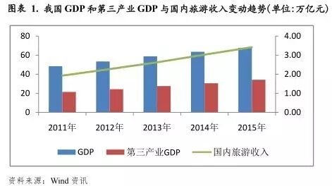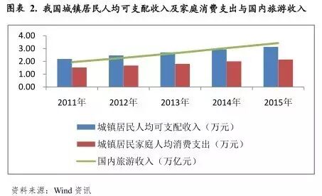 从旅游业的发展规律看, GDP的增长和人均可支配收入的增加是旅游业发展的根本动力。近年来,我国GDP及城乡居民收入的稳定增长直接推动了旅游业的发展,国内旅游业总收入总体保持增长趋势。据国家旅游局公布数据显示,2015年,我国国内旅游人数40亿人次,国内旅游收入3.42万亿元,同比分别增长10.5%和13.0%。