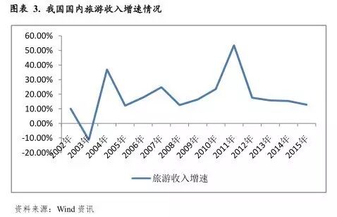 从影响旅游业发展的主要因素看,除GDP增长、人民收入水平提升及旅游产业政策扶持等有利因素外,旅游业对外部环境存在较强的敏感性,容易受到各种突发事件影响。2003年,受非典疫情影响,我国旅游业收入首次出现负增长;2013年以来,受“八项规定”、“六项禁令”等政策影响,公务旅游消费急剧下降,当年国内部分景区旅游人次接待量出现下滑,旅游收入增速放缓,2013-2015年,国内旅游收入增速分别为15.72%、15.36%和12.81%。