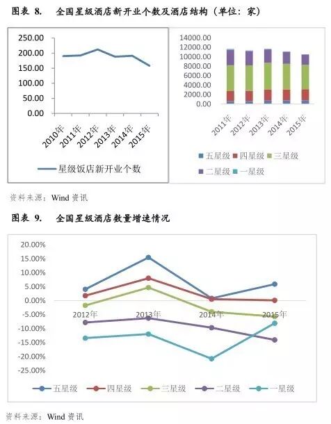 从供给方面来看,2013-2015年及2016年上半年,我国星级酒店分别新开业188家、191家、158家和70家,新开业个数整体呈波动下滑趋势。从酒店结构看,我国星级酒店中三星级数量超过5000家,占比最高,近三年均占星级酒店总数的约48%,同时因其数量众多、竞争相对激烈,近年来数量持续大幅下滑。其次,二星级及四星级酒店占比均超过20%,随着民众生活水平的日益提高、对旅游住宿需求的提升,四星级酒店占比逐年提高,而二星级酒店占比逐年下降。最后,五星级酒店数量占比约在6%,2013年以来受以往行业扩张的惯性影响,增速仍保持在一定规模。