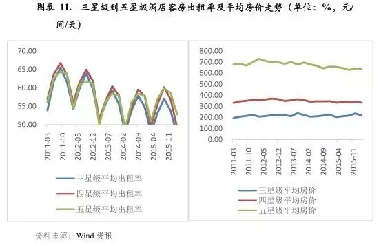 从客房出租率来看,酒店客房出租业务有明显的季节性。一般第一季度受春节节假日等因素影响,客房出租率较低,之后各季度客房出租率则持续上升。2000年以来,我国星级酒店客房出租率走势出现三个较大的拐点,首先为2003年非典爆发,影响当年星级饭店客房出租率暴跌,但在之后的几年逐渐恢复;其次2008年受国际金融危机影响,星级饭店客房出租率再次大幅下跌;最后2012年以来,受三公消费政策影响、酒店行业整体消费下降,以及新开业星级酒店数量仍在增长的影响,星级饭店的客房出租率连年下滑,2013-2015年,全国星级饭店客房出租率分别为55.97%、54.20%和54.19%。