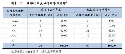 旅游企业目前发债主体数量相对较少,但因信用级别AA级占比居多,信用质量总体较高,发行债券类型较为多样。2016年上半年度,除超短期融资券外,旅游企业合计发行6支一般短期融资券、10支中期票据、5支一般公司债和3期企业债,具体发行利差情况详见附录二。