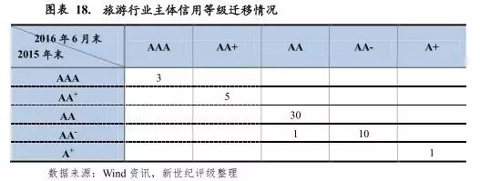 从等级迁移方面看,目前旅游行业发债企业多数为以景区经营类为主,企业多辅以餐饮及住宿等相关配套业务,旅游产业链初步形成。仅以酒店餐饮为主业的发债企业较少。景区经营类企业由于拥有的旅游资源或景区一般具有较强的不可替代性,旅游需求呈现一定刚性,相应的企业整体经营及信用质量得以保持稳定。2016年上半年度,鉴于资本实力及收入水平大幅增长等因素,陕西华山旅游集团有限公司信用级别由AA-级上调至AA级,其他旅游行业内企业未发生主体信用等级以及评级展望调整情况。