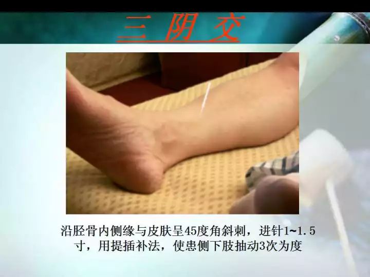 三阴交:为足太阴脾、足厥阴肝、足少阴肾经之交会,可补三阴,益脑髓,调气血,安神志。本穴为回阳九针之一,统治足三阴经所主治的病证。