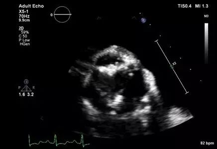 图2 四腔切面显示,二尖瓣重度增厚特征