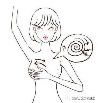 2.触:右手提至头部后侧,用左手检查右乳,用指腹轻压,感觉是否有包块,从开始做环状顺时针方面检查,逐渐向外(约三四圈),至全部检查完为之,用同样的方法检查另一侧。
