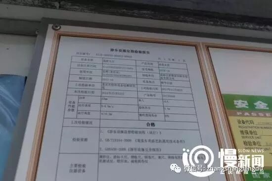 据慢新闻-重庆晚报报道,慢新闻-重庆晚报记者到丰都朝华公园和人民医院等地采访,据报道,遨游太空铝板墙上挂着一份游乐设施定期检验报告。报告使用单位一栏,填写的人名叫张辉。遨游太空产品类别是“观览车类”,制造单位为成都市新都新安游乐设备有限公司,制造日期为2013年10月。设备上次检验日期为2015年12月9日,本次检验日期为2016年12月12日,离此次事故发生不到两个月。上次检验情况与本次检验结论两个地方,字体特意变大加粗的“合格”二字格外醒目。报告右下角盖着“重庆市特种设备检测研究院 检验专用章”的红色钢印,签发日期为2016年12月19日。备注一栏里,特别说明本次检验第5、25项不符合要求,张辉已对上述不符合项进行了整改,经对整改情况资料确认后合格。检验报告旁边挂着一块写有“安全检验合格”字样的绿色牌子,上面注明了下次检验日期:2017年12月11日。