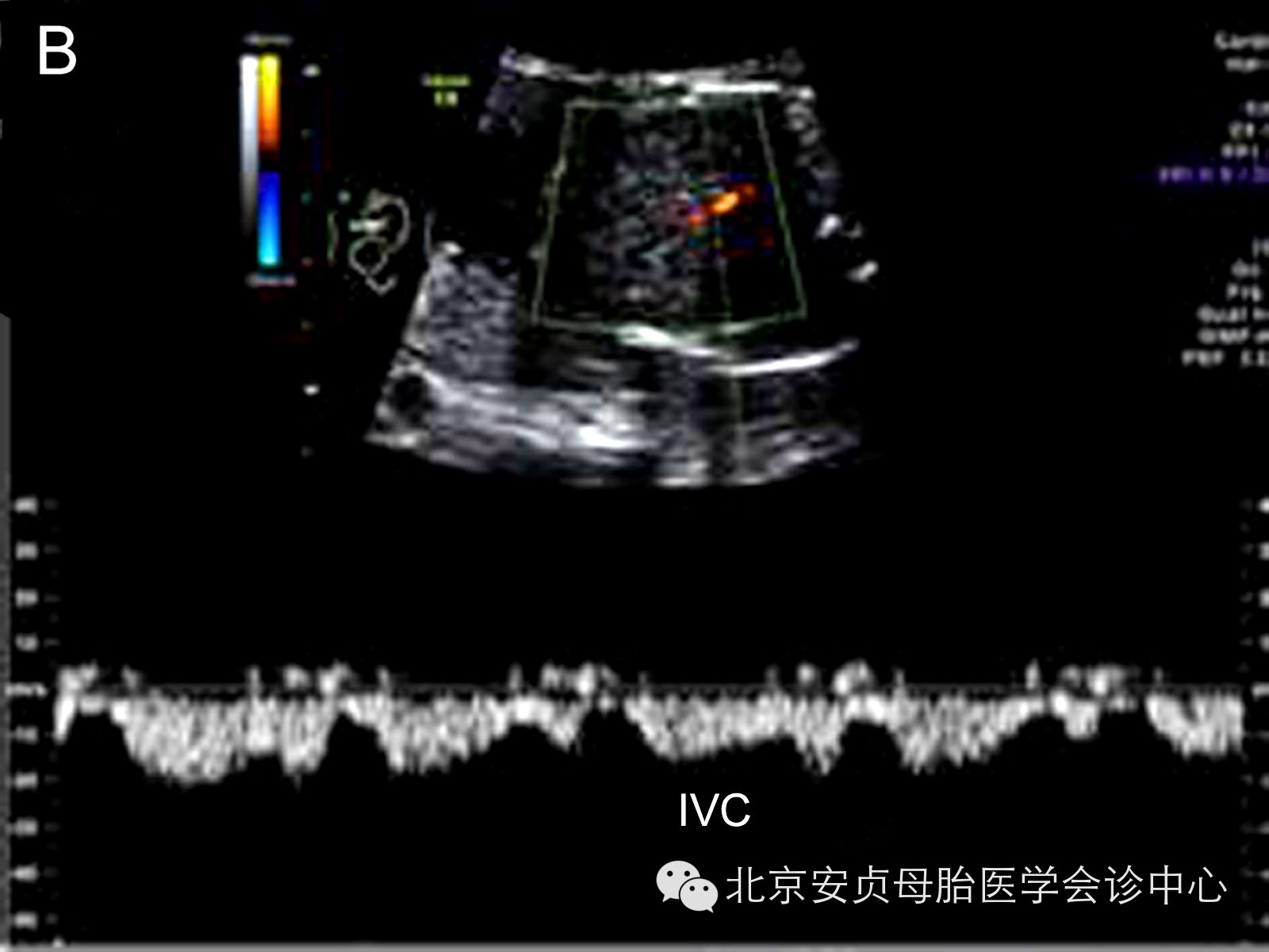 胎儿静脉血流能够客观、非特异性的用于评价心脏功能。对静脉系统频谱波形的分析主要包括:近心水平的静脉导管、下腔静脉、肝静脉、肺静脉;远心水平的腹内段脐静脉。与心房紧密相关的近心端静脉血流频谱正常均表现为多相血流波形。远心端脐静脉表现为无波动性的、低阻力连续静脉频谱波形。当上述静脉系统波形异常时,表明胎儿心脏舒张或收缩功能异常、心脏后负荷增加。