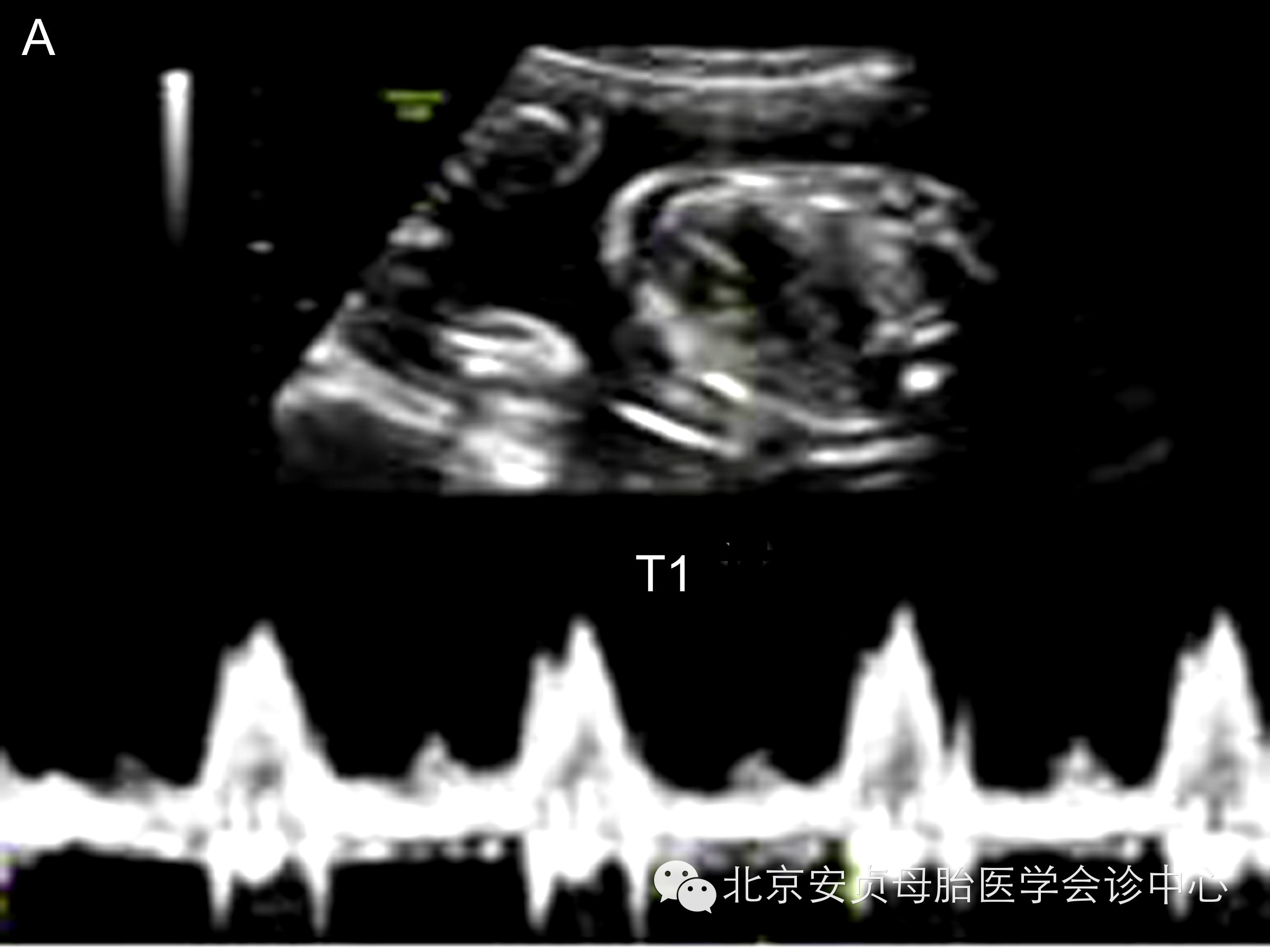 胎儿期房室瓣口舒张期血流频谱呈双相波:心室舒张早期E峰和心室舒张晚期(心房收缩)A峰。由于胎儿的心肌僵硬度较高,心房的收缩功能对心室充盈具有更加重要意义,整个孕期表现为E/A比值<1。随着孕周的增长,E/A比值随之增加,由妊娠早期的0.53±0.05增加至妊娠晚期0.70±0.02。随着孕周增长E/A比值增加表明心肌顺应性不断完善,胎盘血管阻力降低。正常二尖瓣口血流频谱为双峰,三尖瓣血流频谱可为双峰也可表现为单峰。当双侧房室瓣口血流频谱均为单相波改变时,表明心脏舒张明显受限。另外胎儿心动过速时表现为E、A峰融合,呈单峰。