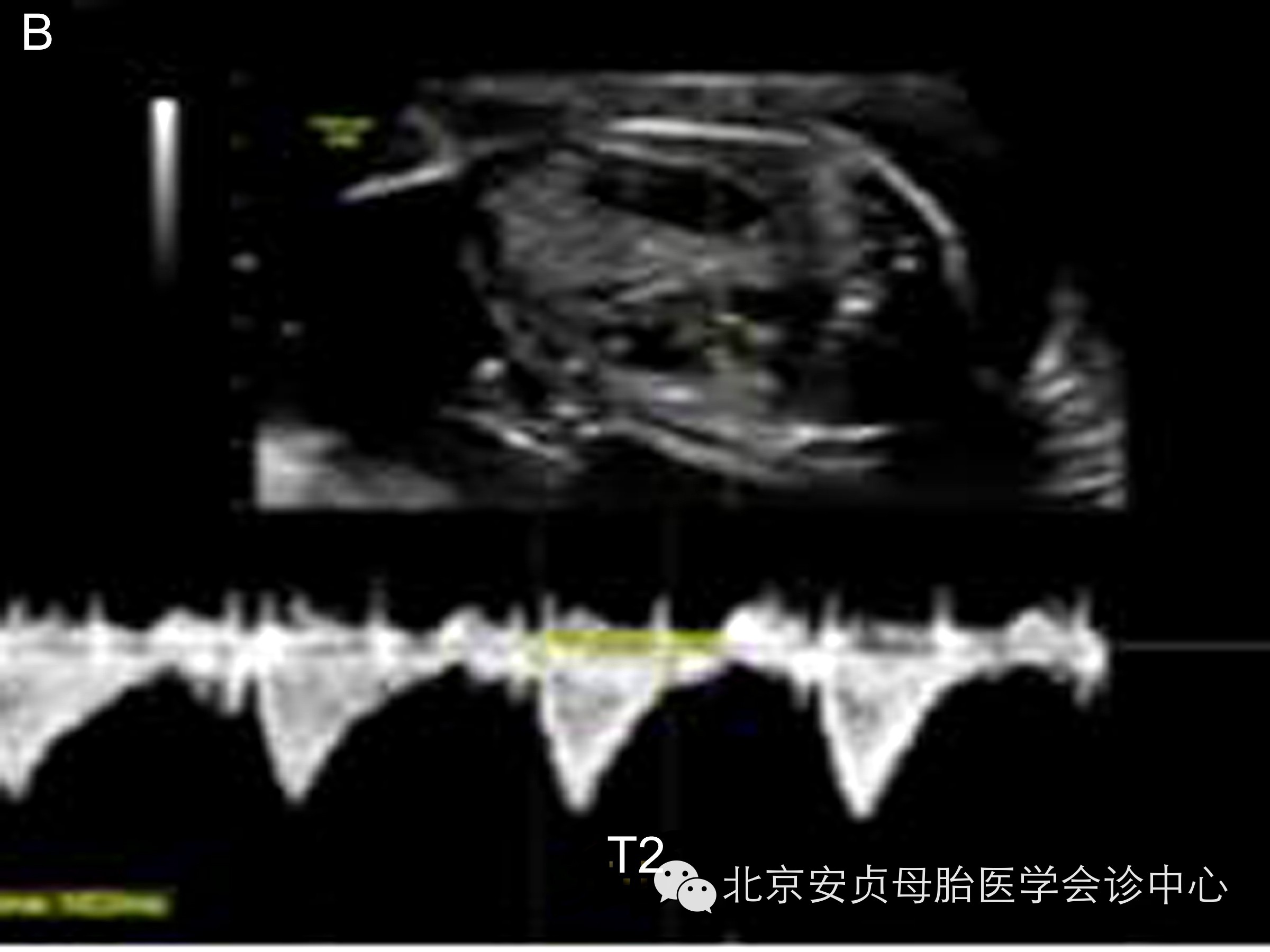 超声提示:胎儿心脏增大、心功能减低、三尖瓣反流(重度)、二尖瓣反流(轻度)、肺动脉瓣近闭锁(不除外功能性闭锁)、动脉导管逆灌注。