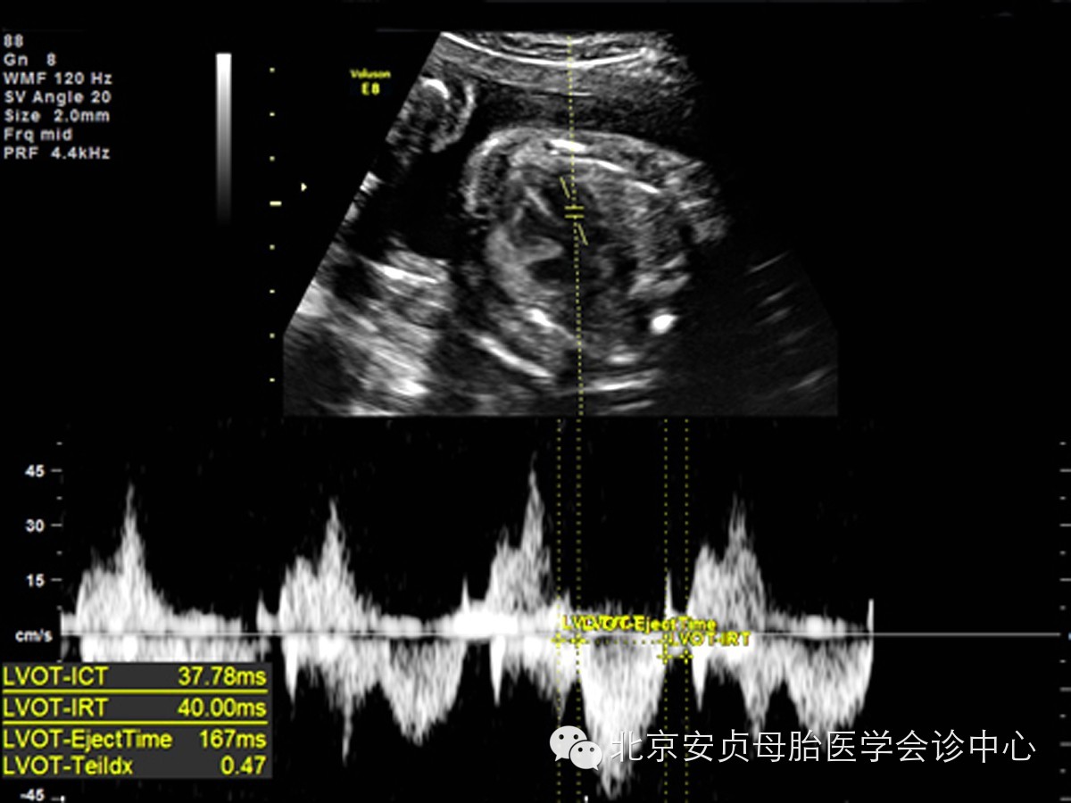 Tei指数不受心腔几何形态改变和心率的影响,是一项检测心功能异常的敏感指标。胎儿心脏收缩和舒张功能处于一个动态发展、相互关联的过程,心功能异常时二者相互影响,因此综合评价二者比较合理。Tei指数= ( ICT + IRT) /ET (注:ICT:心室等容收缩时间,IRT:心室等容舒张时间,ET:心室射血时间)。以频谱多普勒取二尖瓣、三尖瓣、主动脉、肺动脉的血流频谱代入公式进行计算。Tei指数在整个孕周中保持相对稳定范围内,各孕期间无明显差别,正常Tei指数<0.50,Tei指数>0.60为异常。