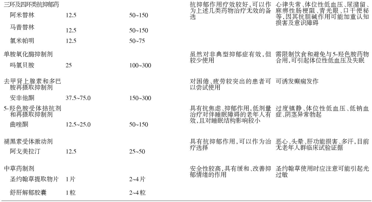 抗抑郁药治疗是老年期抑郁障碍的主要治疗措施,老年患者接受抗抑郁药治疗可以减轻抑郁症状,缓解抑郁发作,总体疗效与年轻人相当。常用抗抑郁药的建议起始剂量和治疗剂量如表1所示,因老年人药物耐受性较差,仍建议个体化调整初始用药剂量。伴心血管疾病患者可以酌情选择安全性较高、药物相互作用较少的治疗药物如舍曲林等。伴有明显焦虑、疼痛等躯体症状的患者可以选择有相应治疗作用的抗抑郁药如文拉法辛、度洛西汀等,可考虑短期小剂量合并使用苯二氮类药以及其他抗焦虑药。伴有明显睡眠障碍的患者也可选则具有镇静和睡眠改善作用的抗抑郁药,如米氮平、曲唑酮等。难治性抑郁和单纯抗抑郁药疗效不佳的患者可以考虑抗抑郁药之外的其他药物增效治疗,如第2代抗精神病药喹硫平、阿立哌唑等。中枢兴奋剂对部分迟滞、低动力状态老年抑郁障碍患者有效,但尚无有效性验证,临床使用需谨慎。关于锂盐的抗抑郁增效作用结论不一致,老年人应慎用。