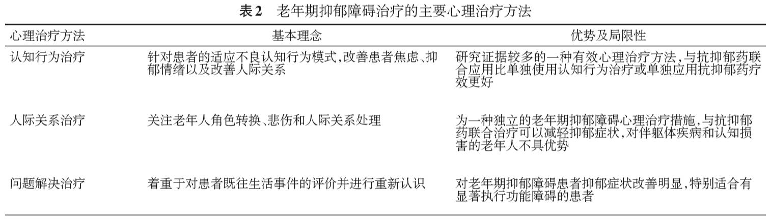 3. 心理治疗:心理治疗能改善老年抑郁障碍患者的无助感、无力感、自尊心低下以及负性认知,但目前心理治疗在老年人中应用并不充分。适用于老年人的心理治疗方法包括支持性心理治疗、认知行为治疗、问题解决治疗、人际关系治疗、行为激活治疗、生命回顾治疗以及正念治疗等,主要的心理治疗方法见表2。老年期抑郁障碍治疗中可以单独采用心理治疗和(或)药物治疗联合应用。心理治疗一般需要2~4个月才能显现疗效,老年期抑郁障碍治疗中更倾向于心理治疗与其他治疗措施联合使用。