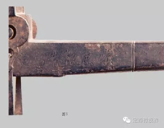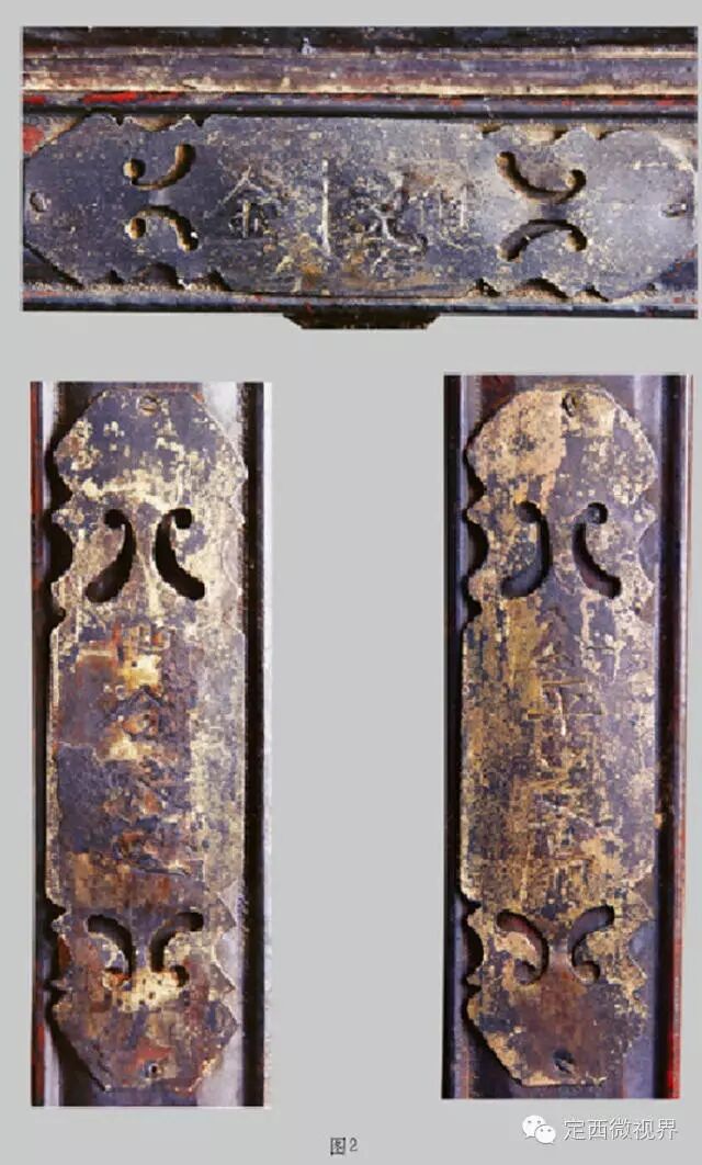 定西市渭源县会川镇发现的这台天平是一件标新立异的箱匣式天平,它与北京故宫博物院所藏康熙时期天平具有异曲同工之妙,是迄今为止定西地区发现的最为完美规整、造型奇特、保存完好的箱匣式天平。它由铜立杆、铜衡、铜盘、箱匣底座等部件组成。木横梁长72.7厘米,木竖边梁高94.5厘米,箱匣宽27.5厘米,高16.5厘米,箱匣上下两层配有三个装砝码用的抽屉,全套材质为松木(故宫博物院所藏天平为木质两层两屉式结构)。横梁上有镂空木板套花,竖梁上角及侧边有云龙纹套花。青铜质竖衡杆上端悬吊在横梁上。两根木质竖梁镶插于箱匣之中。横衡杆长45厘米,两臂为圆锥体,臂两端各置一平圆吊耳,中心竖立杆高23厘米,铜盘直径19.5厘米,厚0.3厘米(图1)。木横梁中心镶有剪花边铜皮,铜皮中间錾刻“日兑斗金”四个楷体大字。木竖梁左右两边也镶有剪花边铜皮,篆刻“公平交易”、“两合人心”八字楷书对联(图2),铜衡臂右侧上錾刻“张惠和老店造”六字楷书铭文(图3)。