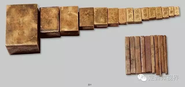 该天平配有15个铜皮锡质砝码一组(图4)。以重量体积为序,依次排列为:叁拾两、拾两、伍两、肆两、叁两、贰两、壹两、玖钱、捌钱、柒钱、陆钱、伍钱、肆钱、叁钱、贰钱。这些砝码虽经长久磨砺,至今仍然保存完美,包浆纯正自然。尤为让人称道的是,为达到称重的高精度和量值的准确性,该天平另配有壹钱、玖分、捌分、柒分、陆分、伍分、肆分、叁分、贰分、壹分等10条竹质砝码,其上铭刻着用毛笔书写的行体量词(图4)。这组纤细精巧的竹质砝码不仅完整无缺,而且色泽古朴自然,是难得一见的竹质权器实物。