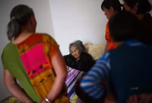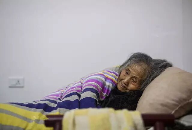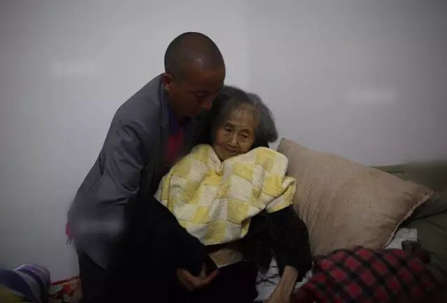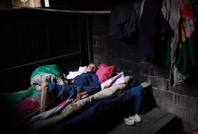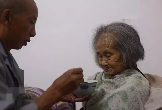乐建九在给孟阿香喂饭。1997年,随着丈夫因意外摔伤去世,照顾三个智障儿子的重担,全落在孟阿香一人身上。为了守着三个儿子,孟阿香至少有70年没离开过四门湾,就连8公里外的小女儿家,她都没法去走动。如今除偶尔晒会儿太阳,孟阿香几乎不再下床。她已不能自行翻身,每餐仅吃小半碗稀饭,身体的排泄则靠每天两片的尿不湿