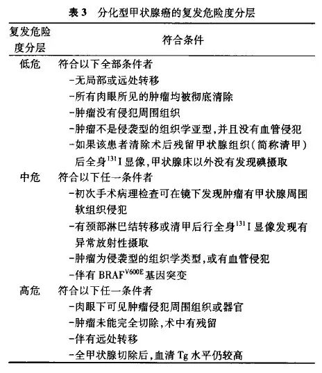 本《指南》推荐采用下述的 3 级分层(表 3)。在完善更加合理的分期和复发危险度分层系统的基础上,认识对患者进行动态评估的重要性,以及时避免过度治疗及治疗不足问题。