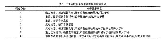 131I 是治疗分化型甲状腺癌 (DTC) 的重要手段,随着 DTC 发病率的逐渐增高,近年来对 131 I 治疗该疾病的理念不断更新,而国内各地开展此项工作的规模和水平却参差不齐,由此中华医学会核医学分会组织编写了《131I 治疗分化型甲状腺癌指南》(2014 版,简称《指南》),旨在使 131I 治疗 DTC 更加规范、科学,以最大程度保护患者利益,保证医疗质量和安全。本《指南》根据循证医学证据和专家意见提出了推荐意见,推荐级别见表 1。