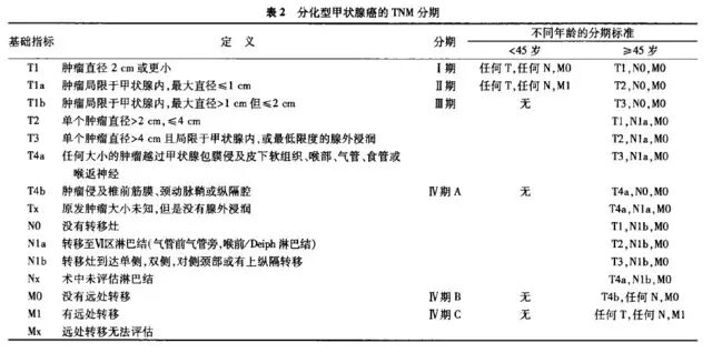 为准确评估 DTC 患者的预后,已有多个 DTC 的危险分层系统,如 TNM,基于远处转移、年龄、肿瘤是否完全切除、甲状腺腺外侵犯及肿瘤大小的评分 (MACIS) 等。目前最常使用的 DTC 术后分层系统是美国癌症联合委员会 (AJCC) 的 TNM 分期(表 2),此系统是基于病理学特征和年龄的分层系统。